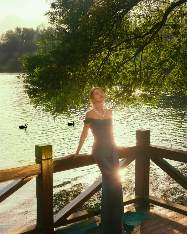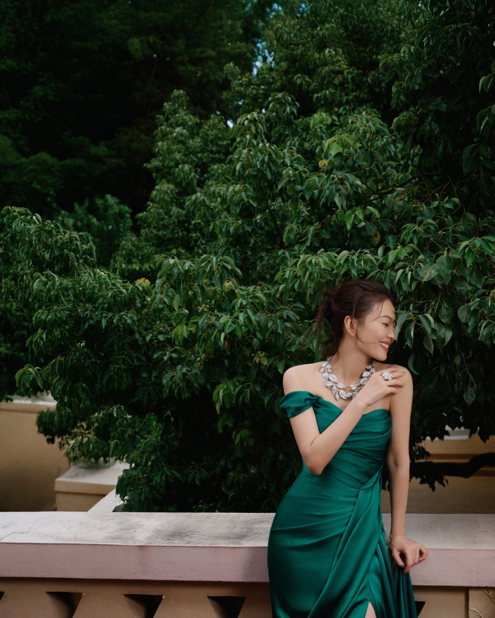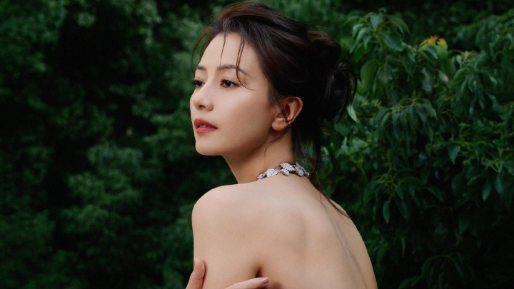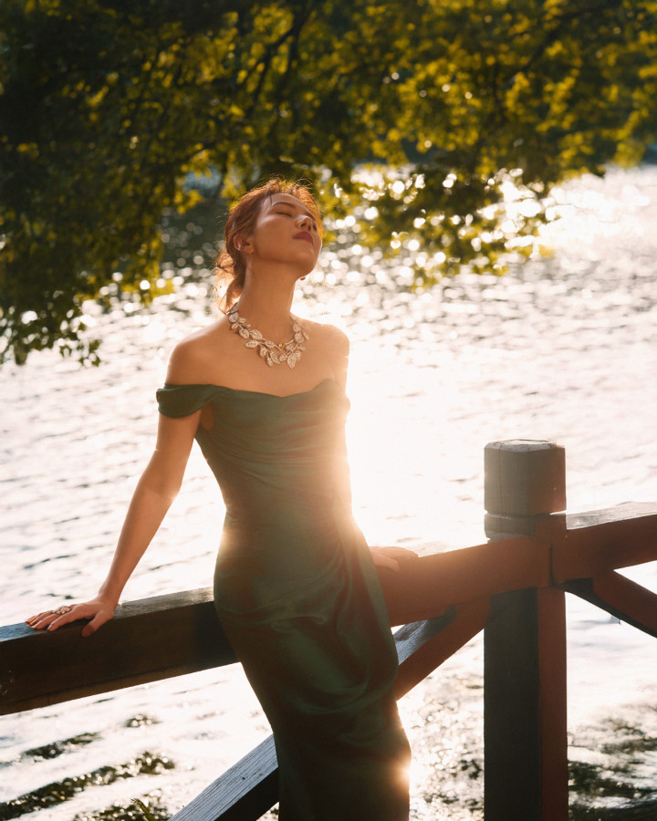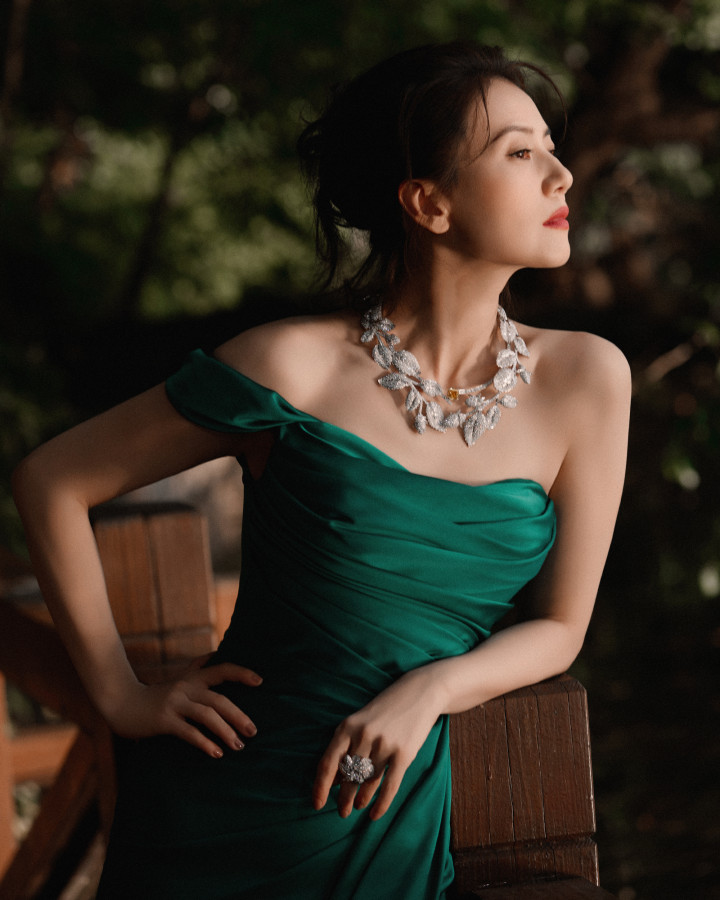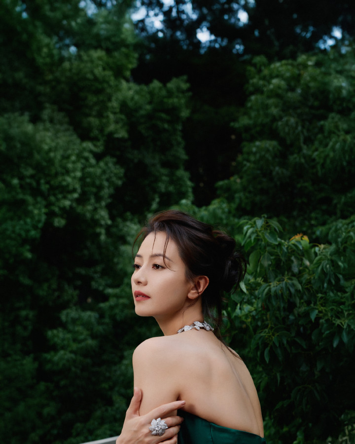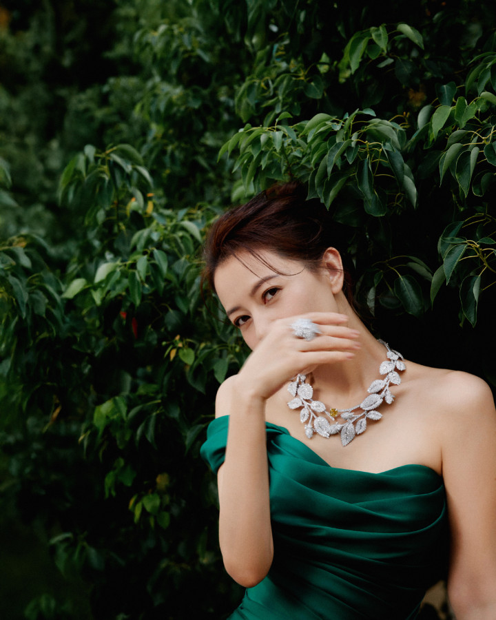 高圆圆绿野仙踪裙杀! 抹胸曳地勾勒细腰, 叶项链锁尽森林呼吸